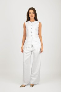 Lniane spodnie z szeroką nogawką – swoboda i styl w letnim wydaniu. Eleganckie spodnie wykonane z naturalnej mieszanki lnu i wiskozy to doskonała baza letnich stylizacji. Model o luźnym kroju z szeroką nogawką gwarantuje komfort noszenia, a zarazem prezentuje się niezwykle stylowo i lekko. Tkanina jest przewiewna, delikatna w dotyku i doskonale układa się na sylwetce. Spodnie mają wysoki stan, delikatne zakładki z przodu oraz dyskretne kieszenie po bokach, dodają casualowej elegancji całej stylizacji. Świetnie sprawdzą się zarówno w duecie z kamizelką NISA, żakietem ELIF jak i w codziennych zestawach z topem czy koszulą.