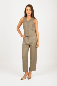 Spodnie z wąską nogawką – szyk i lekkość na co dzień. Spodnie z lnu i wiskozy to idealne połączenie wygody i elegancji. Mają prostą, lekko zwężaną nogawkę, która optycznie wydłuża nogi, oraz wysoki stan z zakładkami delikatnie modelującymi sylwetkę. Przewiewna tkanina sprawia, że to doskonały wybór na ciepłe dni – zarówno do pracy, jak i na spotkania w mieście. Świetnie komponują się z kamizelką NISA i żakietem ELIF z tej samej linii, tworząc spójny, modny zestaw.