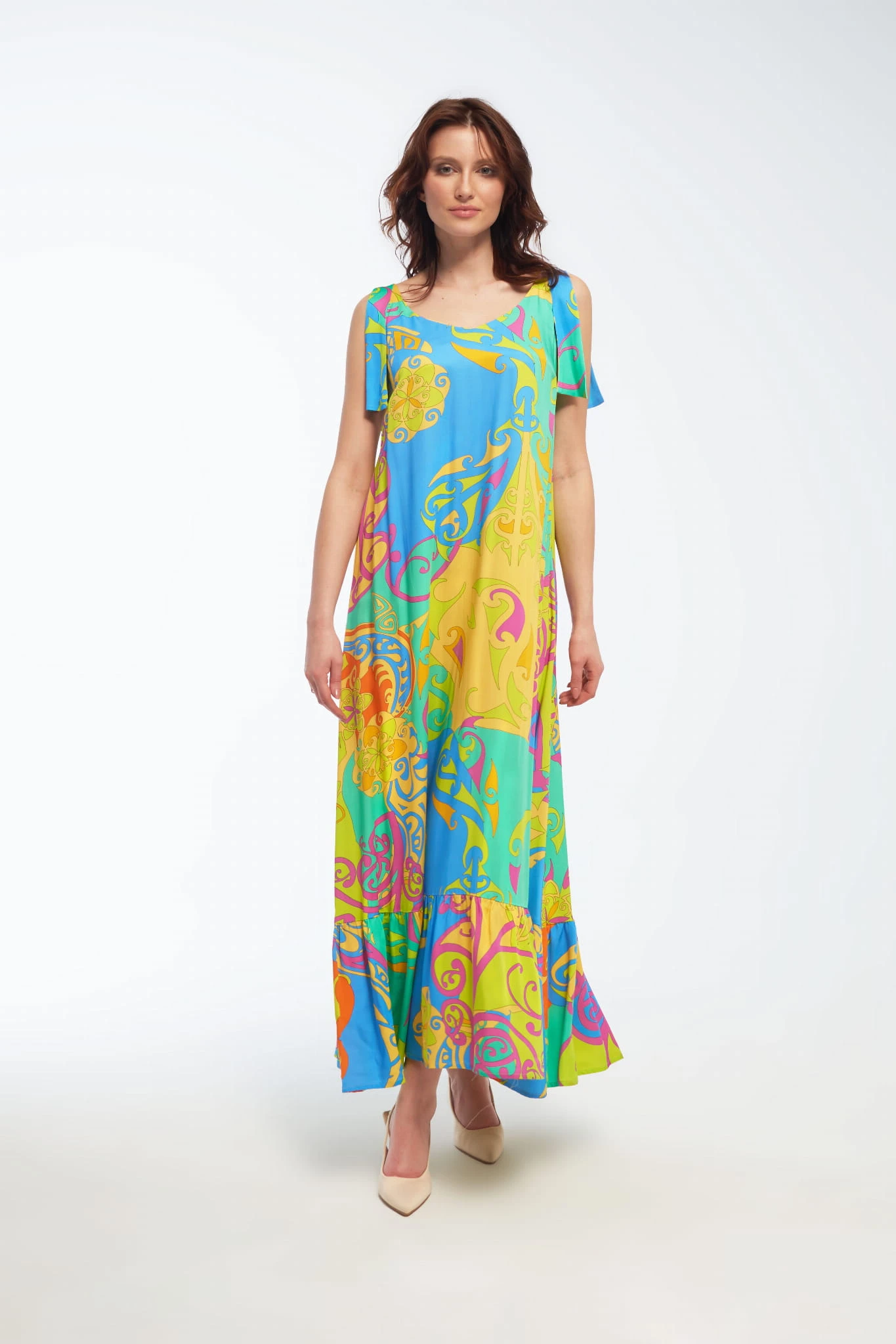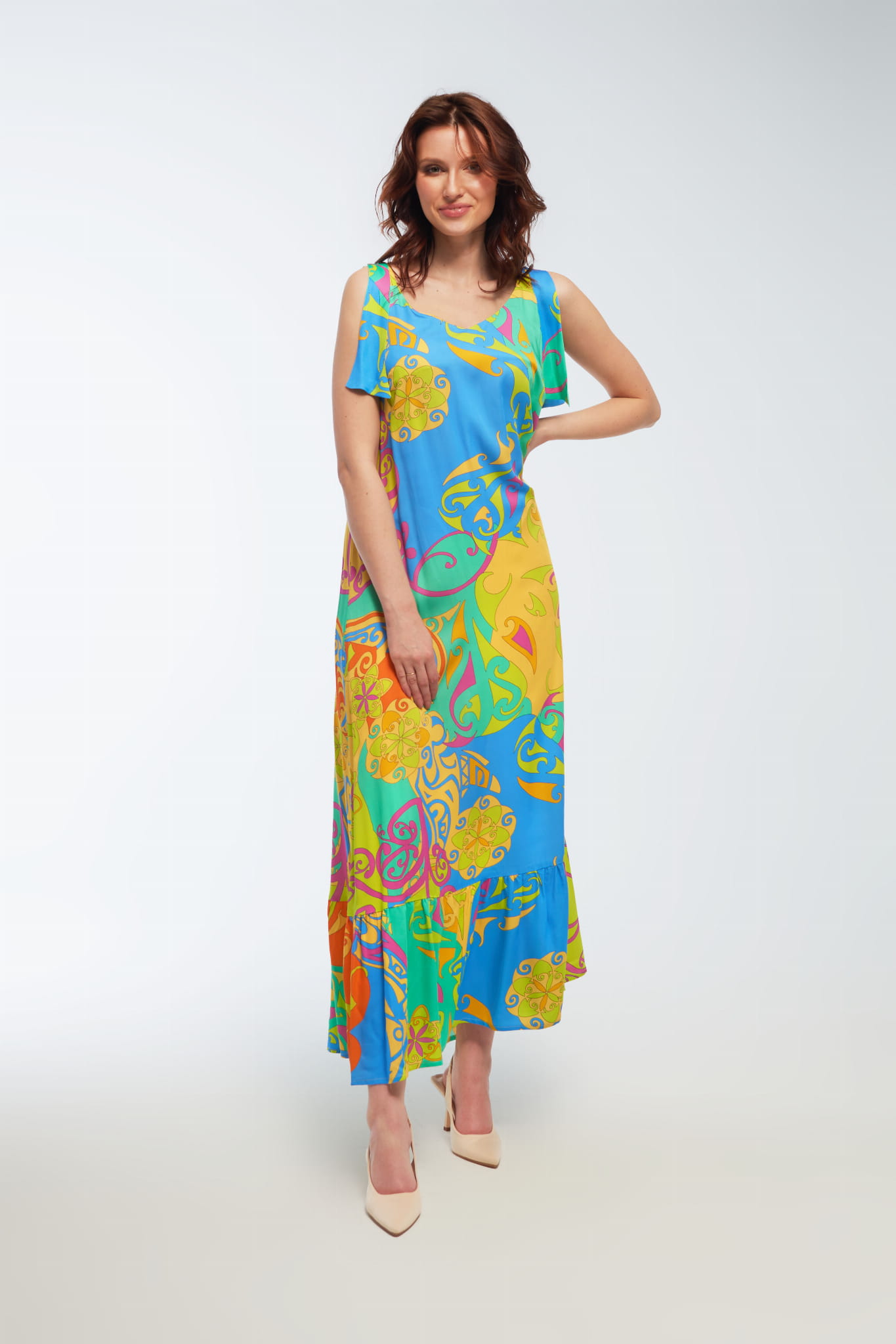 Subtelność i Elegancja: Elegancka, długa sukienka, która emanuje letnim urokiem i wyrafinowaną kobiecością. Wykonana z wysokiej jakości satyny wiskozowej, ta sukienka jest nie tylko wyjątkowo piękna, ale także wygodna w noszeniu. Jej krój w formie litery A nadaje subtelny efekt delikatnego unoszenia się przy każdym kroku. AFINA to doskonały wybór dla kobiet ceniących sobie elegancję, wygodę i letnią lekkość. Idealna na różne okazje, od letnich imprez po romantyczne wieczory.