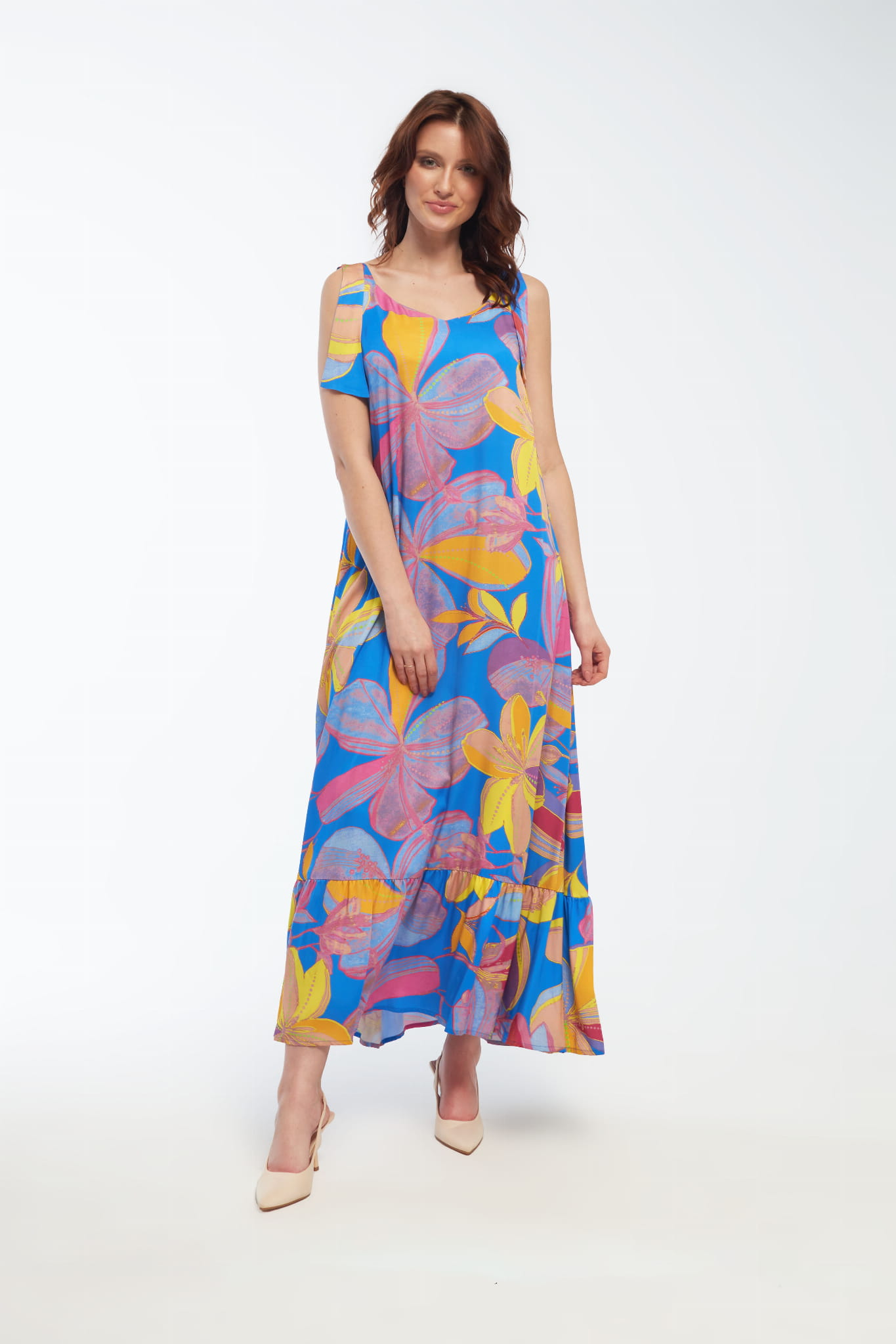 Subtelność i Elegancja: Elegancka, długa sukienka, która emanuje letnim urokiem i wyrafinowaną kobiecością. Wykonana z wysokiej jakości satyny wiskozowej, ta sukienka jest nie tylko wyjątkowo piękna, ale także wygodna w noszeniu. Jej krój w formie litery A nadaje subtelny efekt delikatnego unoszenia się przy każdym kroku. AFINA to doskonały wybór dla kobiet ceniących sobie elegancję, wygodę i letnią lekkość. Idealna na różne okazje, od letnich imprez po romantyczne wieczory.