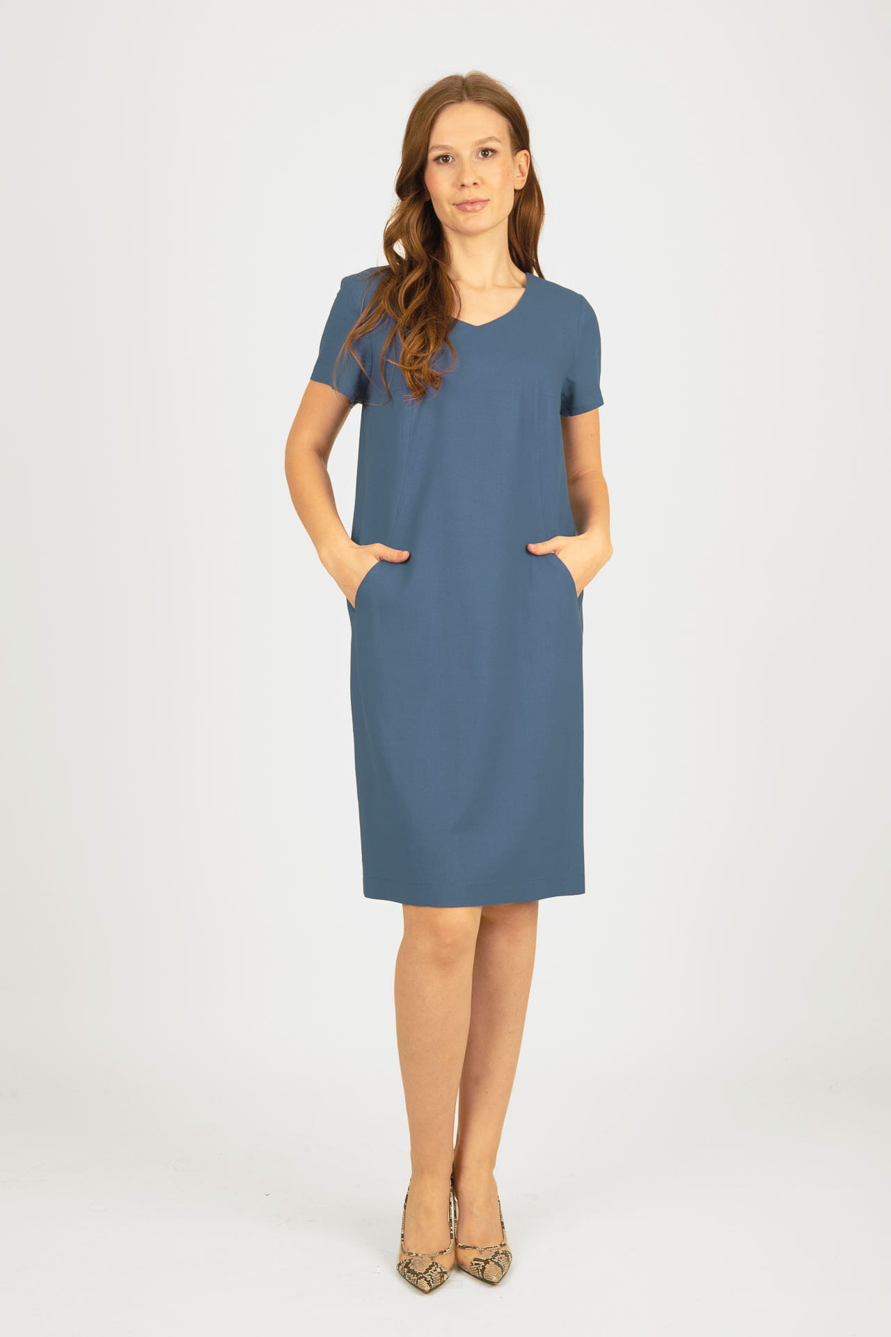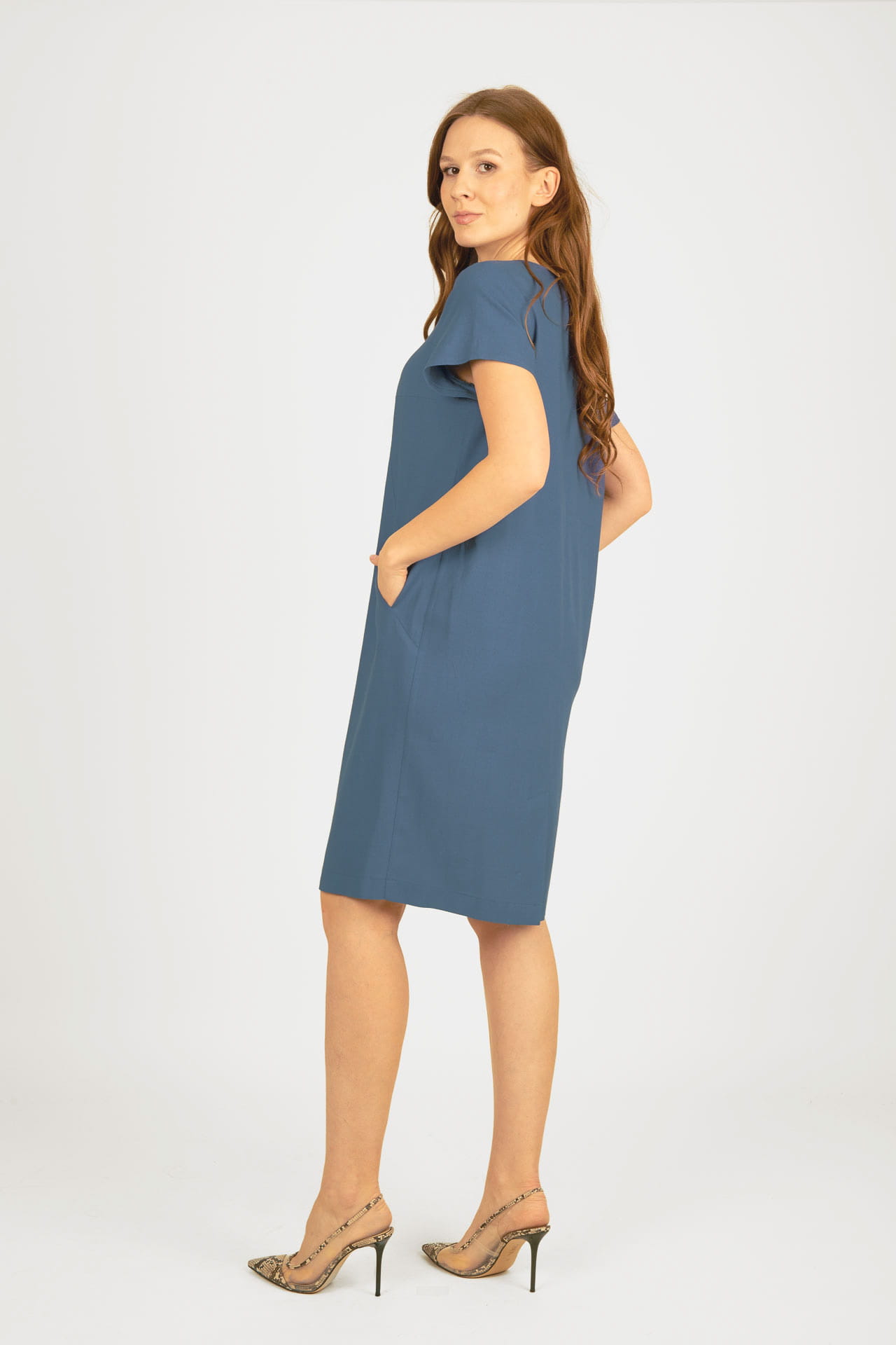 - sukienka taliowana z wpuszczanymi kieszeniami po bokach