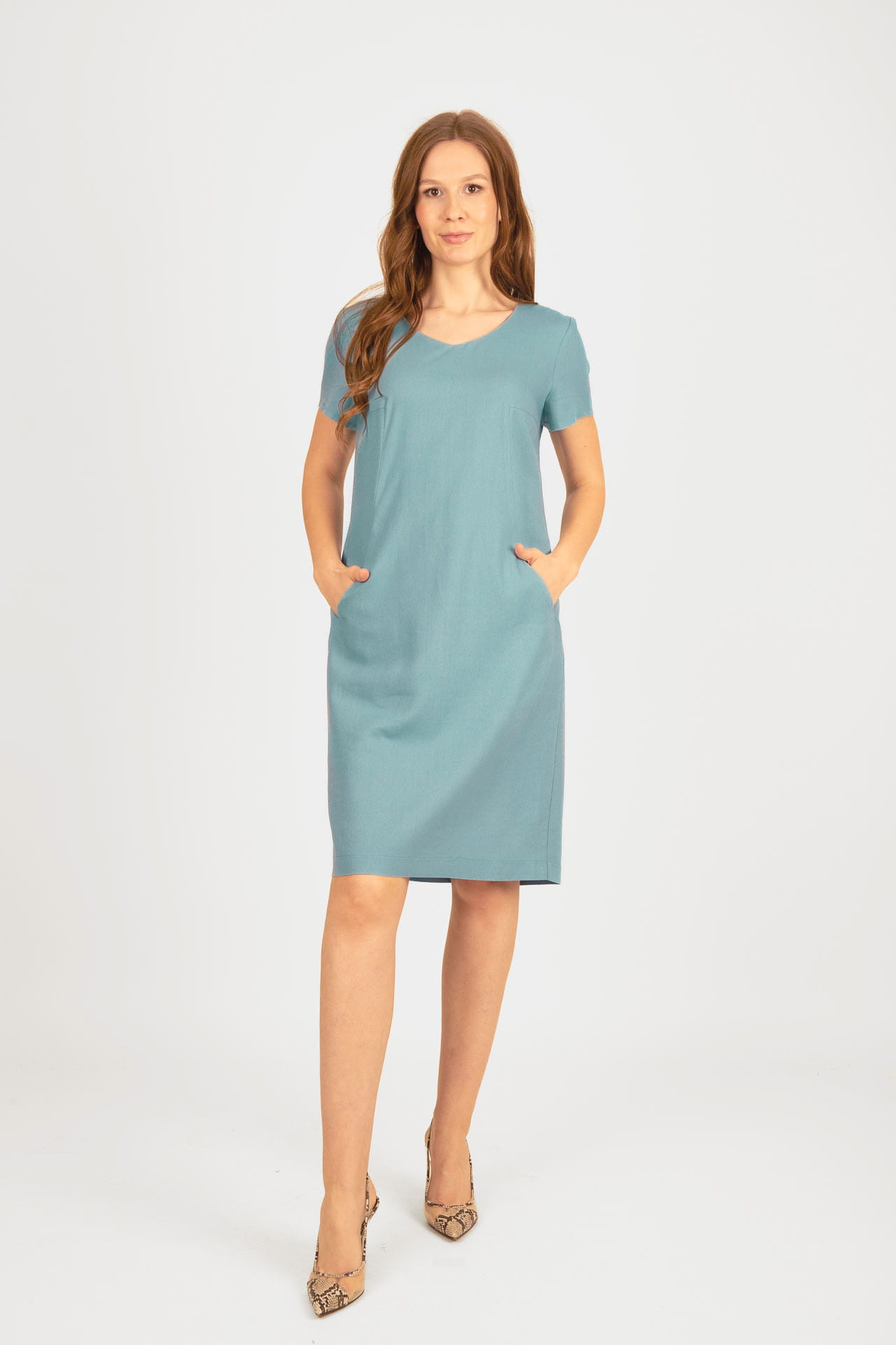 - sukienka taliowana z wpuszczanymi kieszeniami po bokach