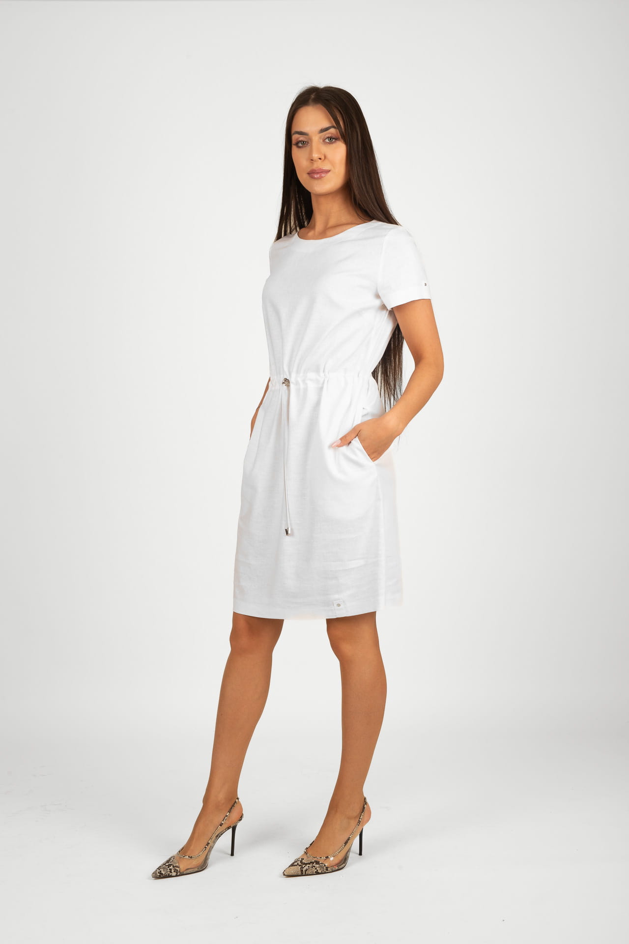 - sukienka z lnu i wiskozy, za kolano, biała