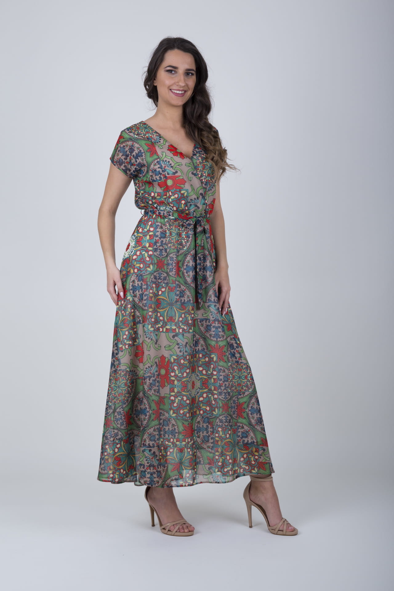 - długa sukienka wzorzysta w kolorze czerwonym