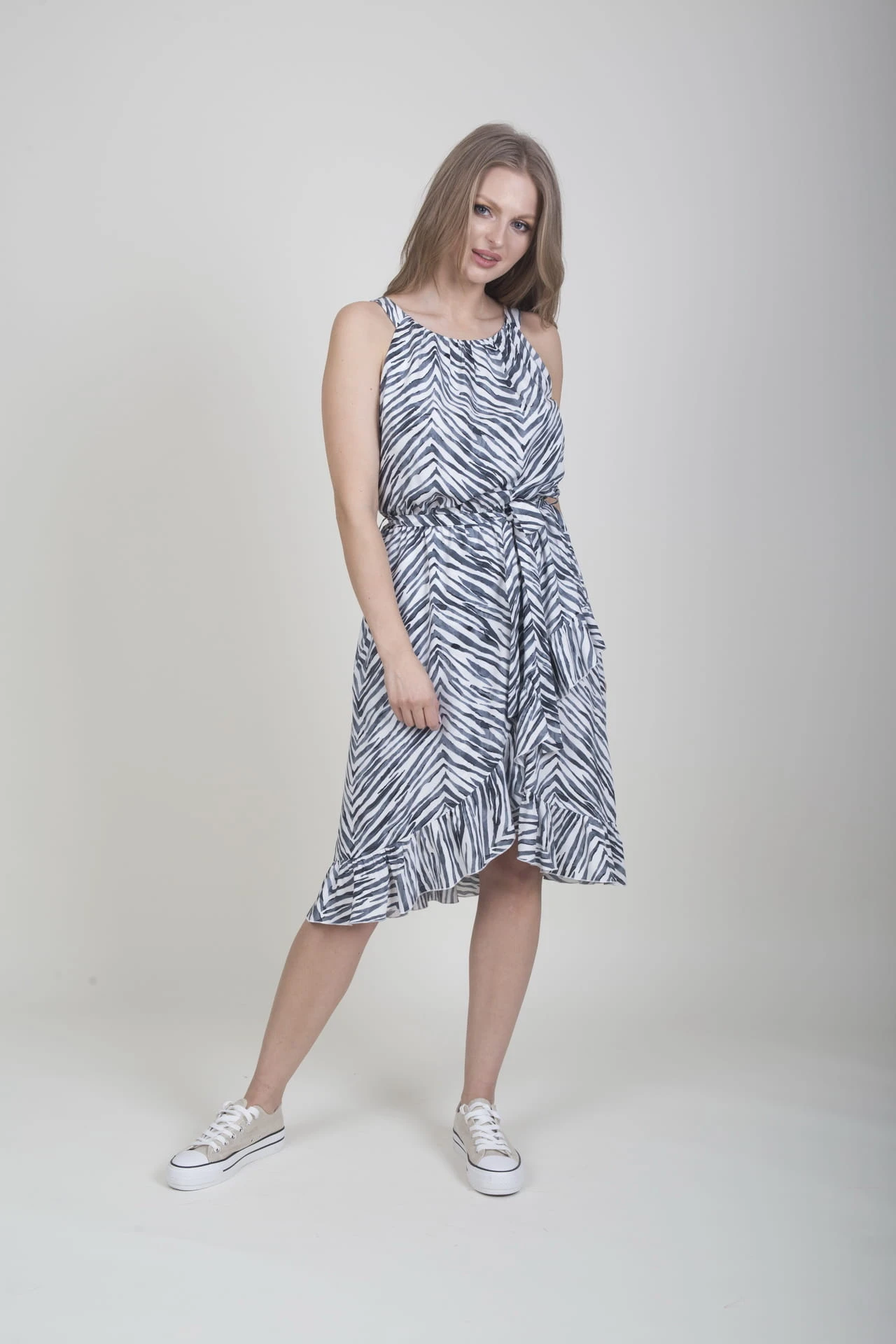 - asymetryczna falbana na przodzie oraz na dole sukienki