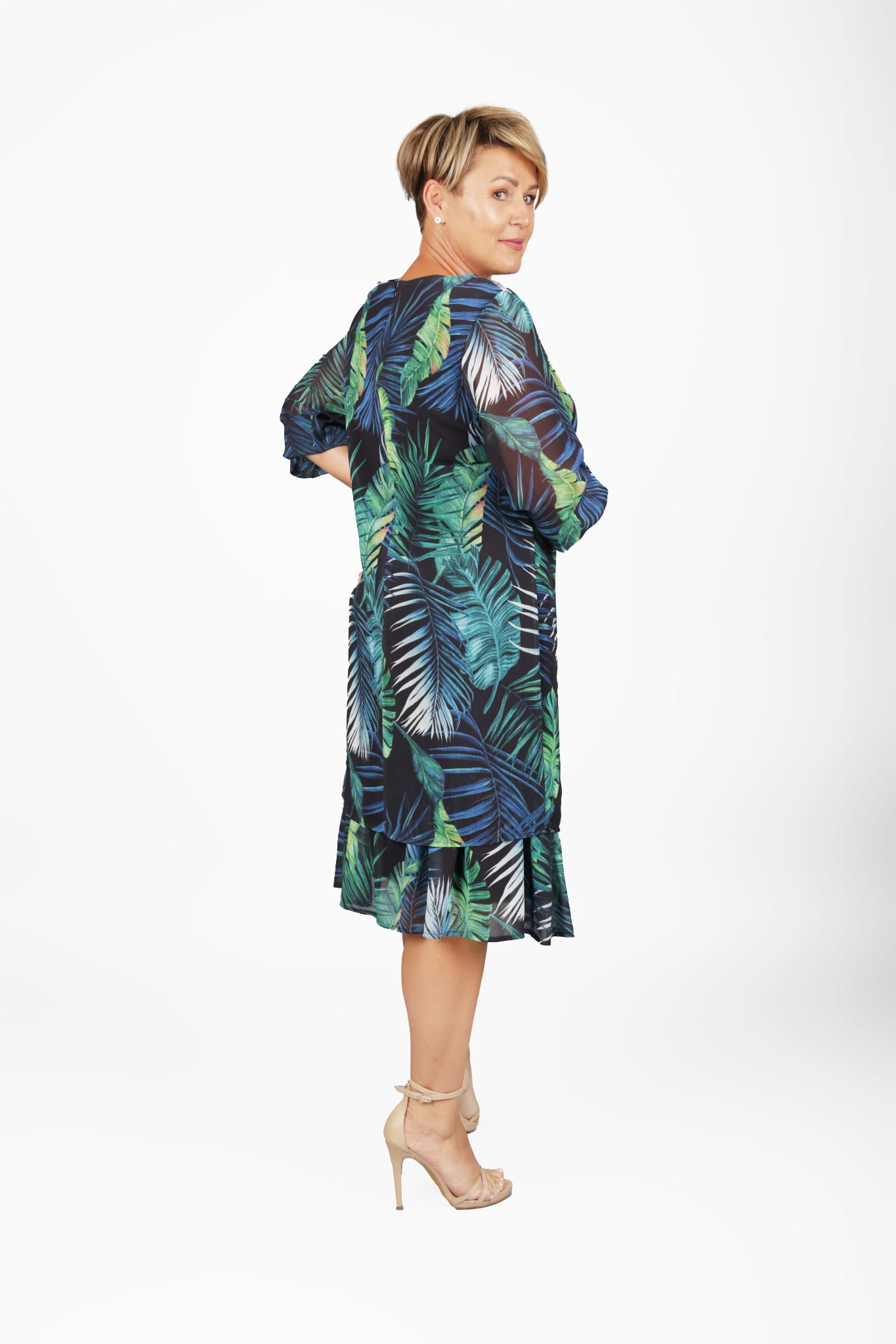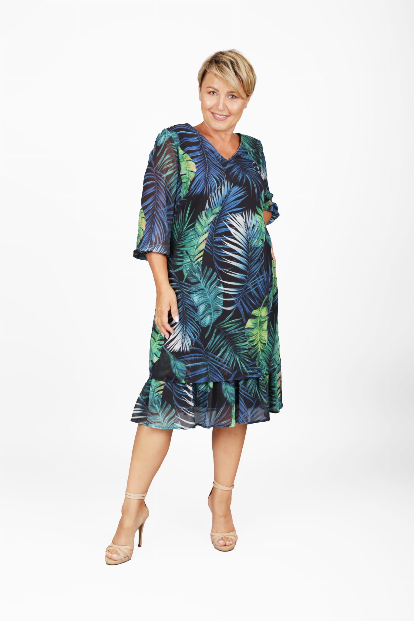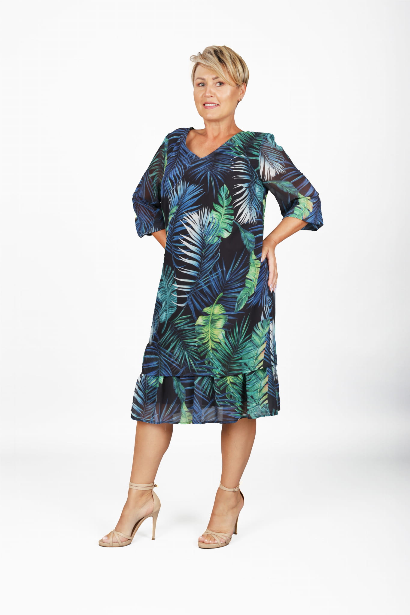- sukienka szyfonowa, w kolorze granatowym z motywem roślinnym