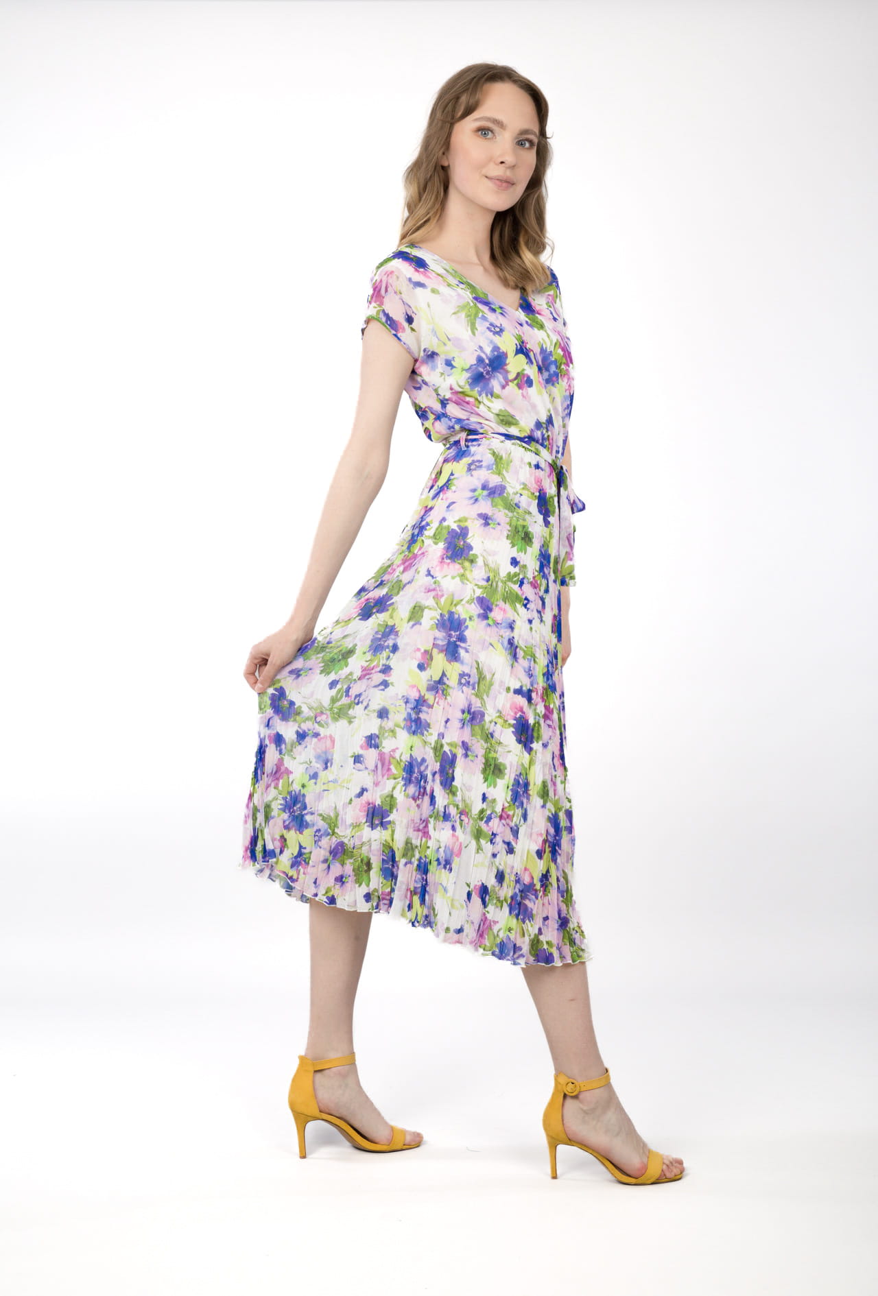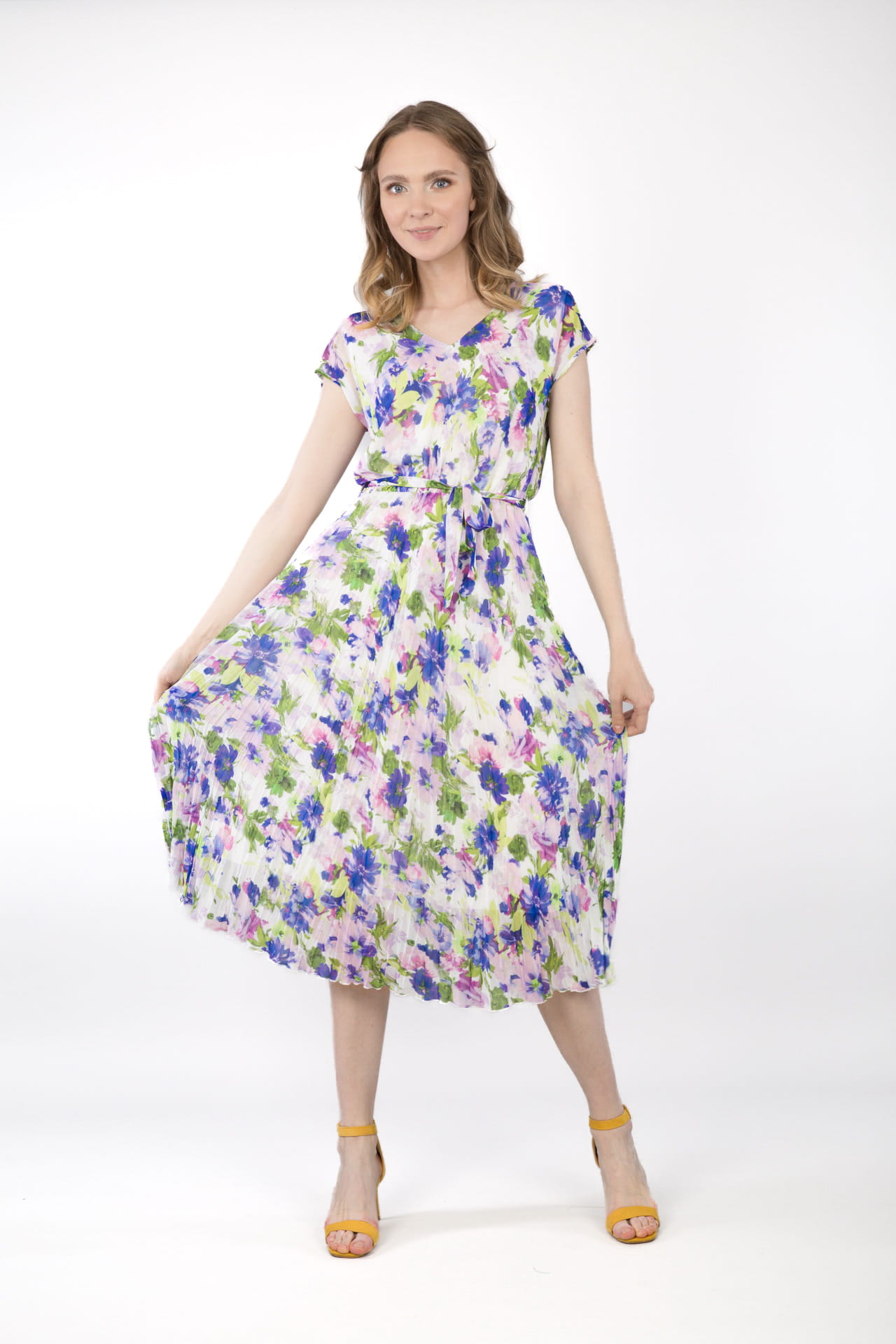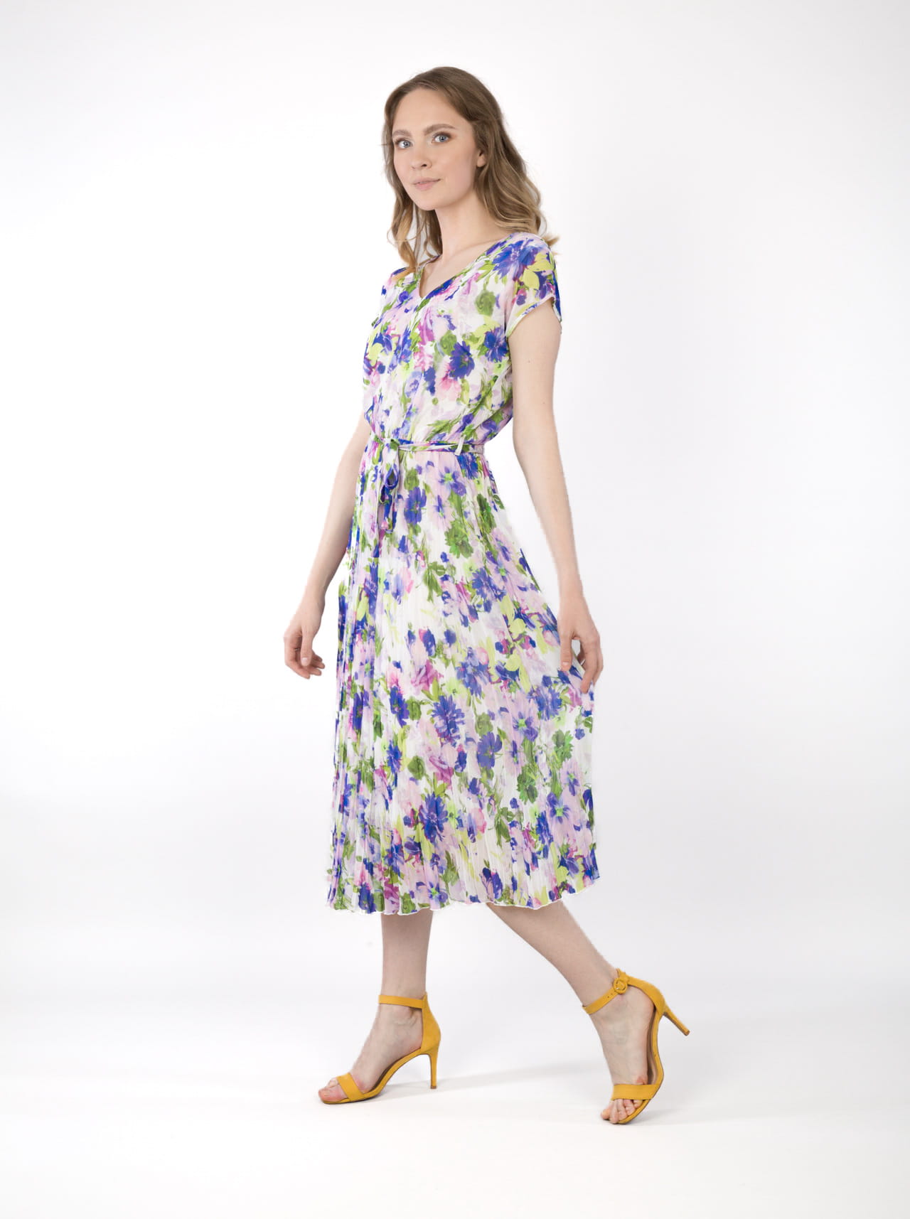 - długa sukienka z szyfonu, wzorzysta, w kolorze fioletowym