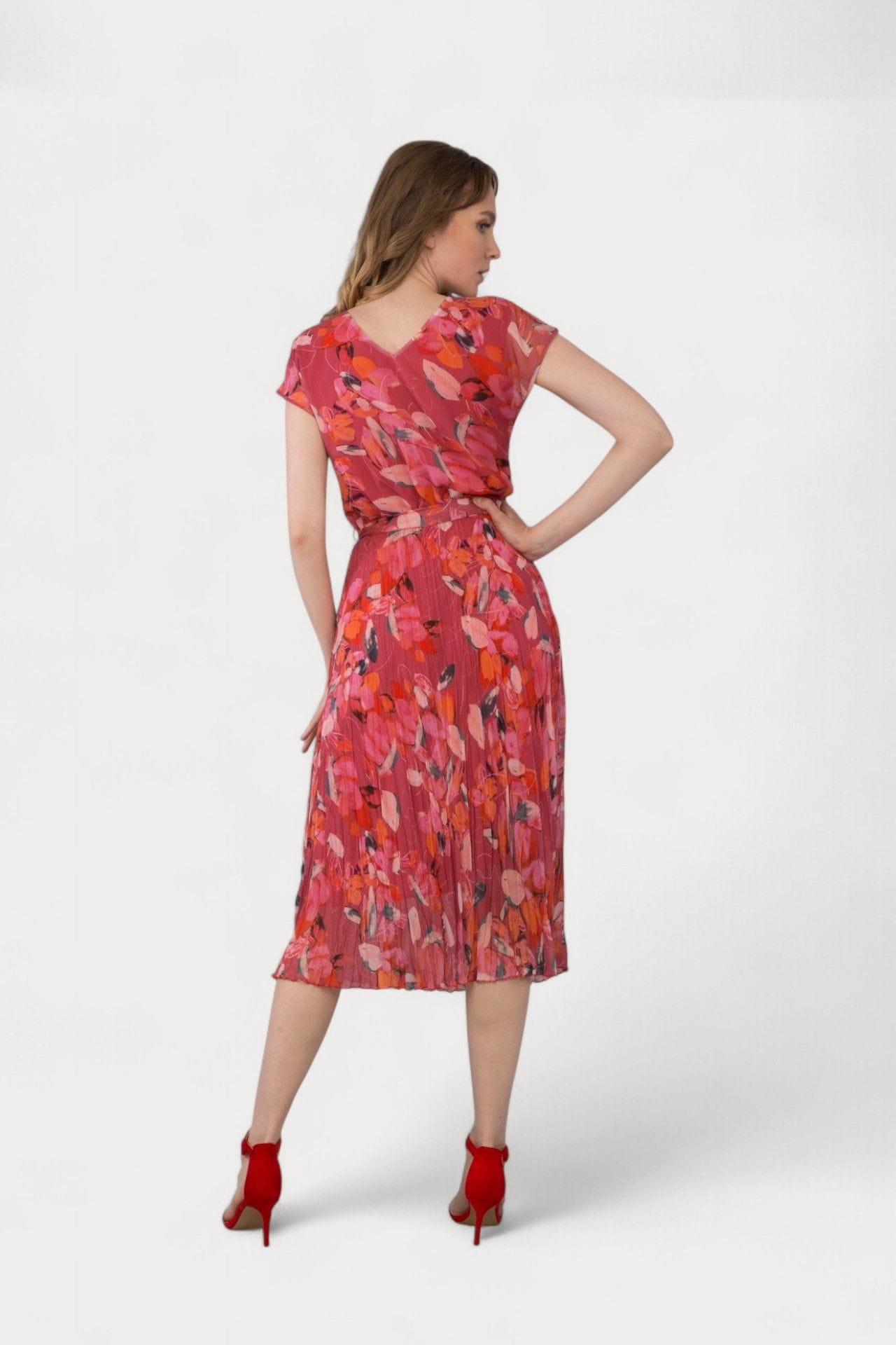 - długa sukienka z szyfonu, wzorzysta, w kolorze koralowym