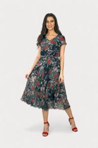- długa sukienka z szyfonu, granatowa z motywem kwiatowym