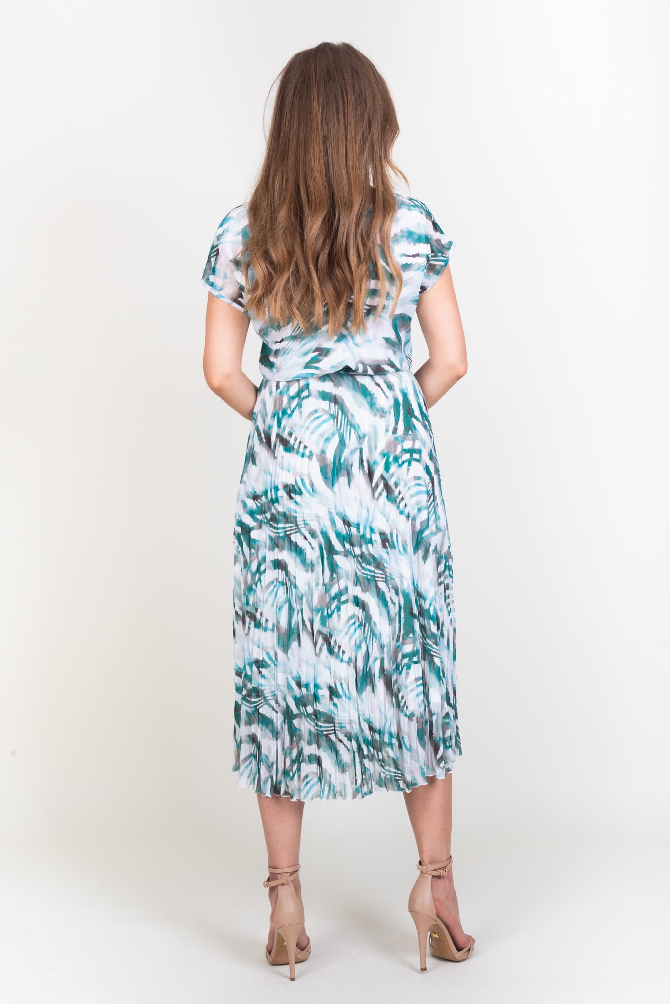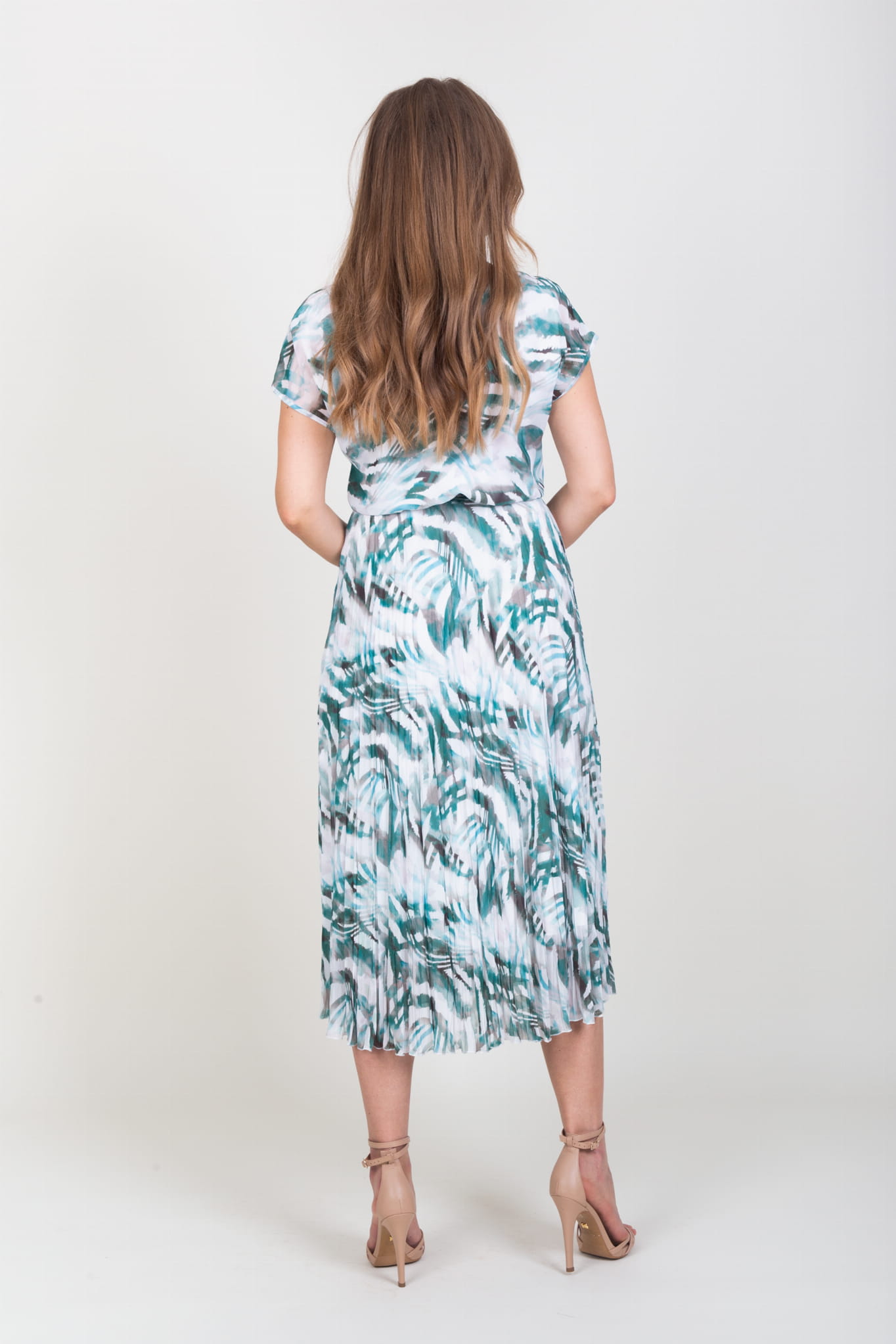 - długa sukienka z szyfonu, wzorzysta w kolorze zielonym