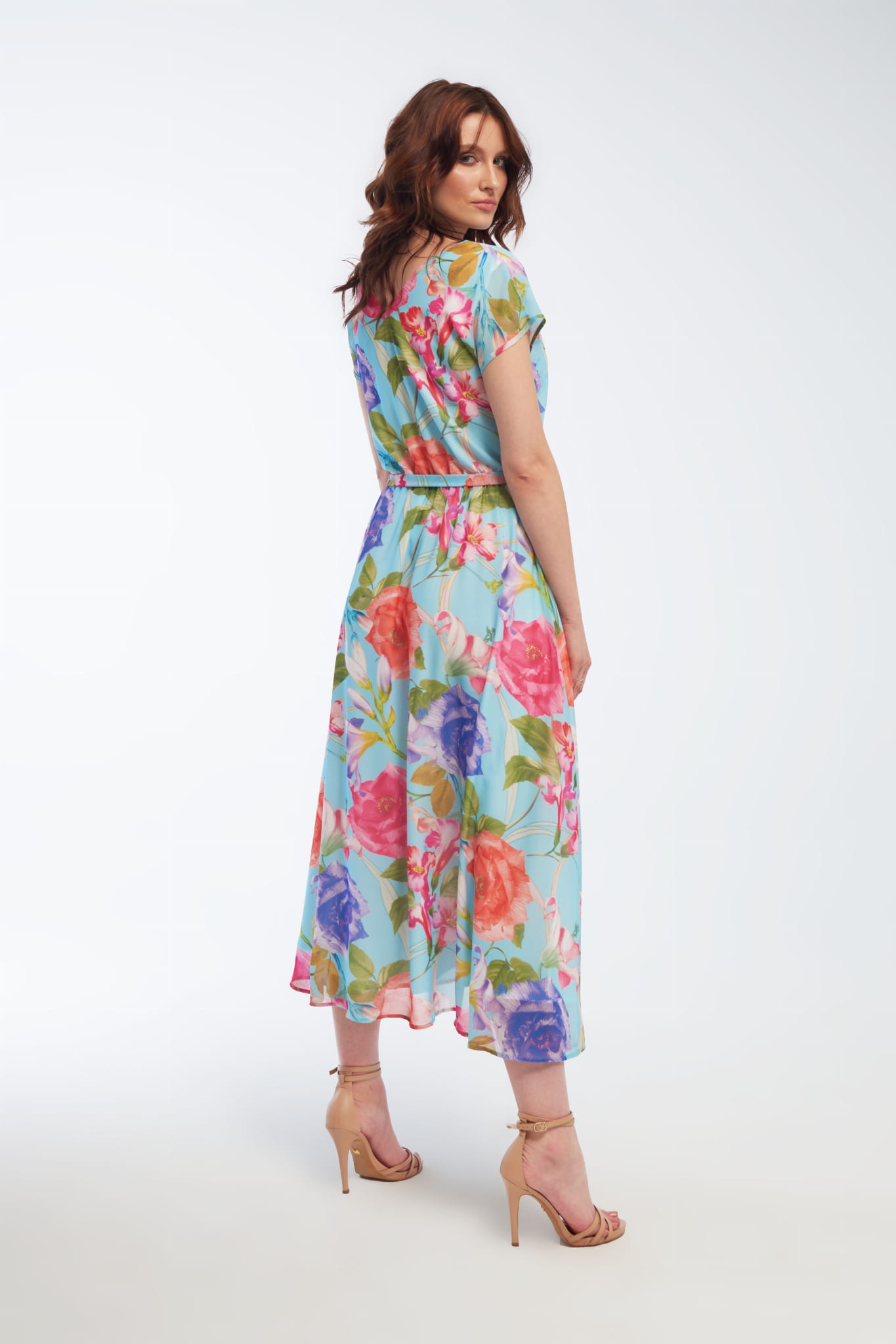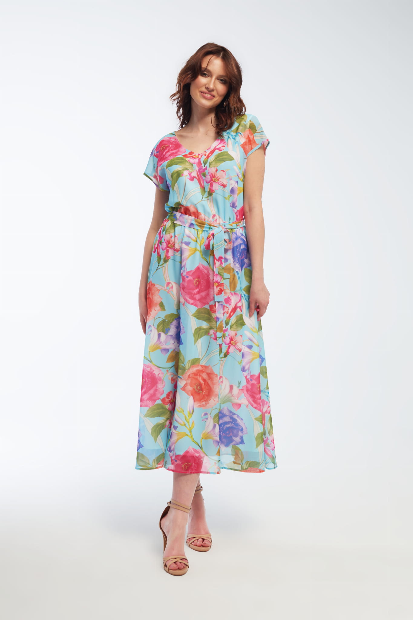 - długa sukienka z szyfonu, z motywem kwiatowym, w kolorze niebieskim