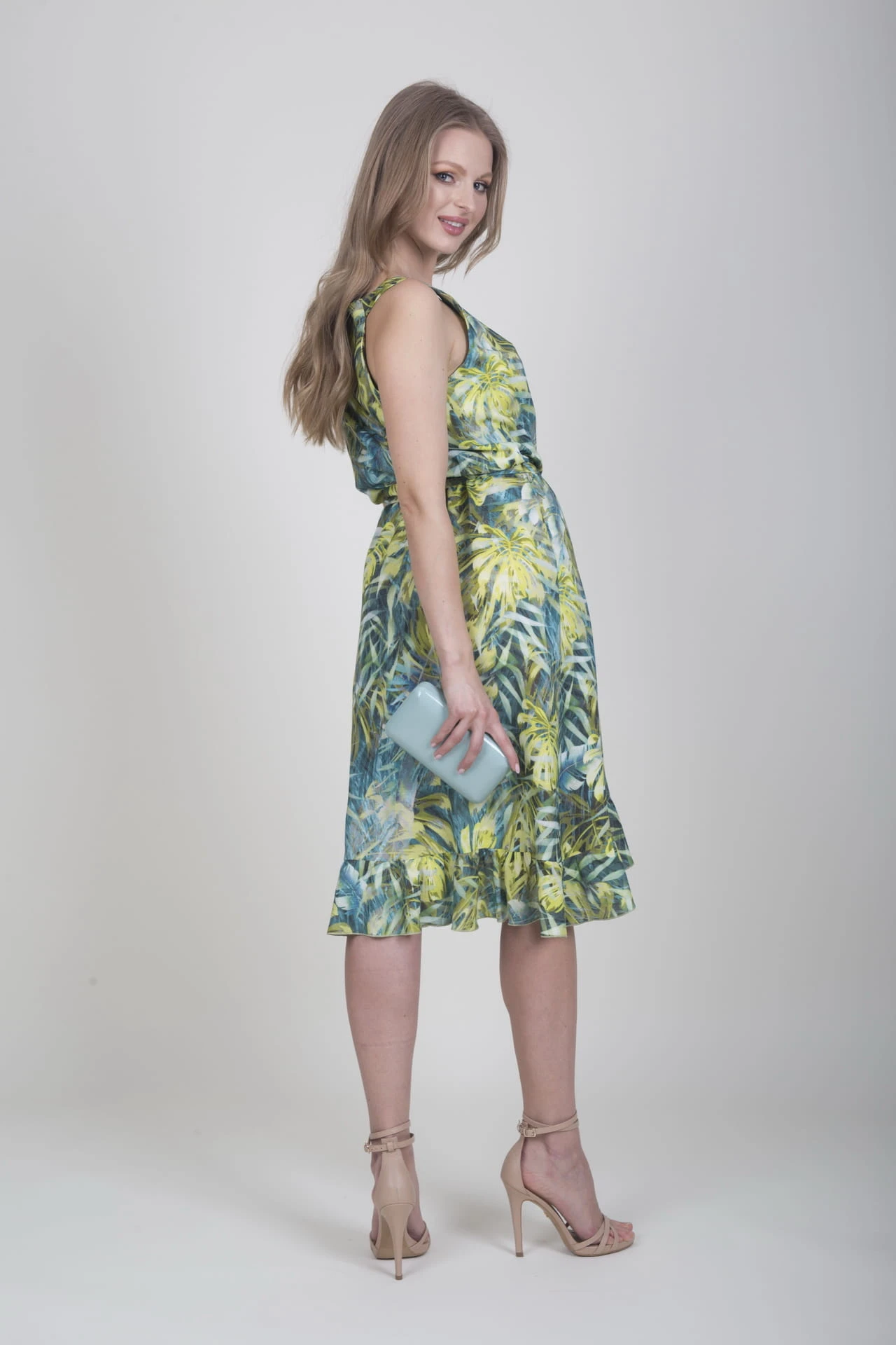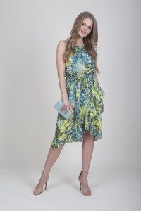 - krótka sukienka w kolorze zielonym z motywem roślinnym