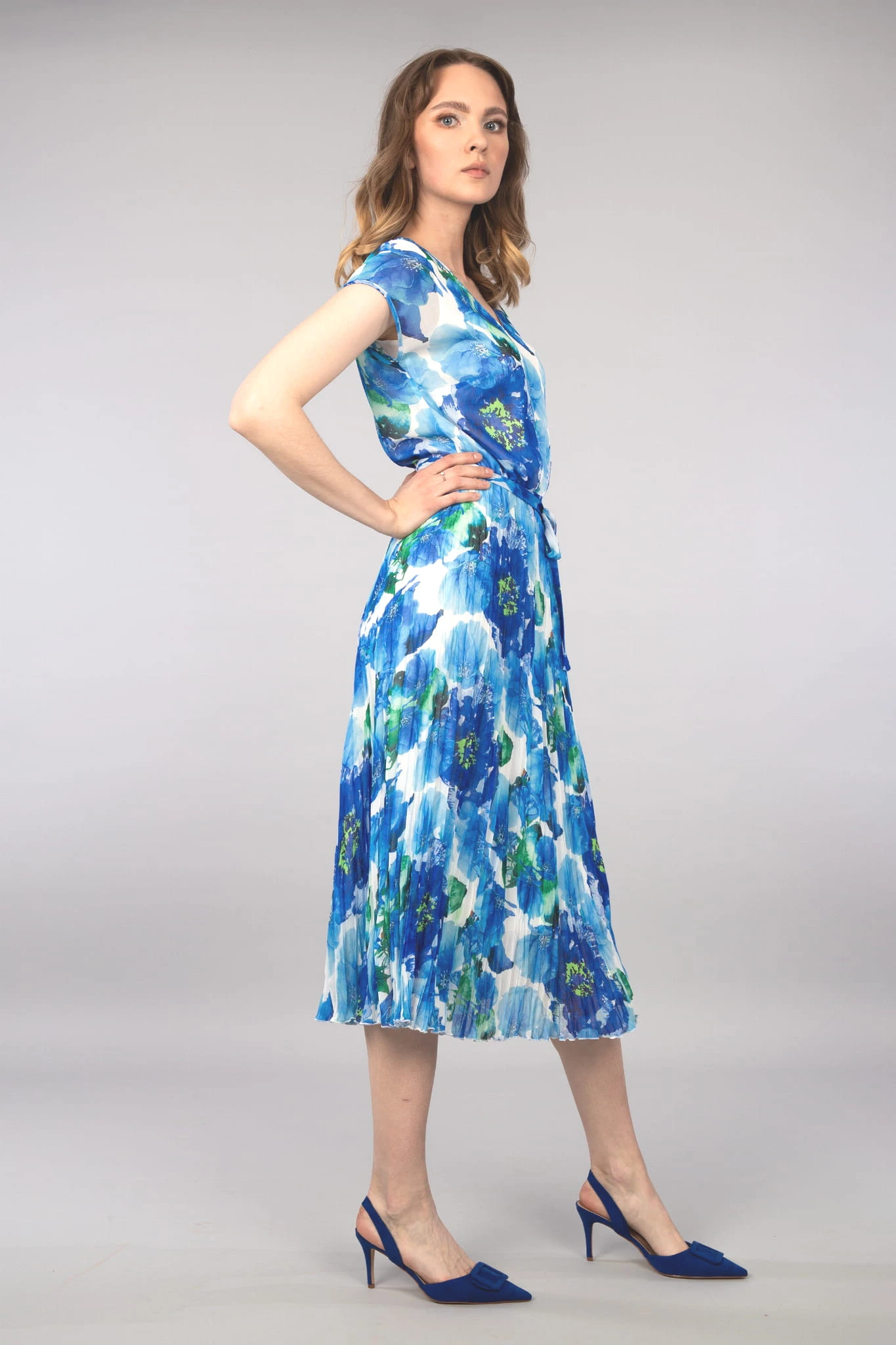 - długa sukienka z szyfonu, w kolorze niebieskim z motywem kwiatowym