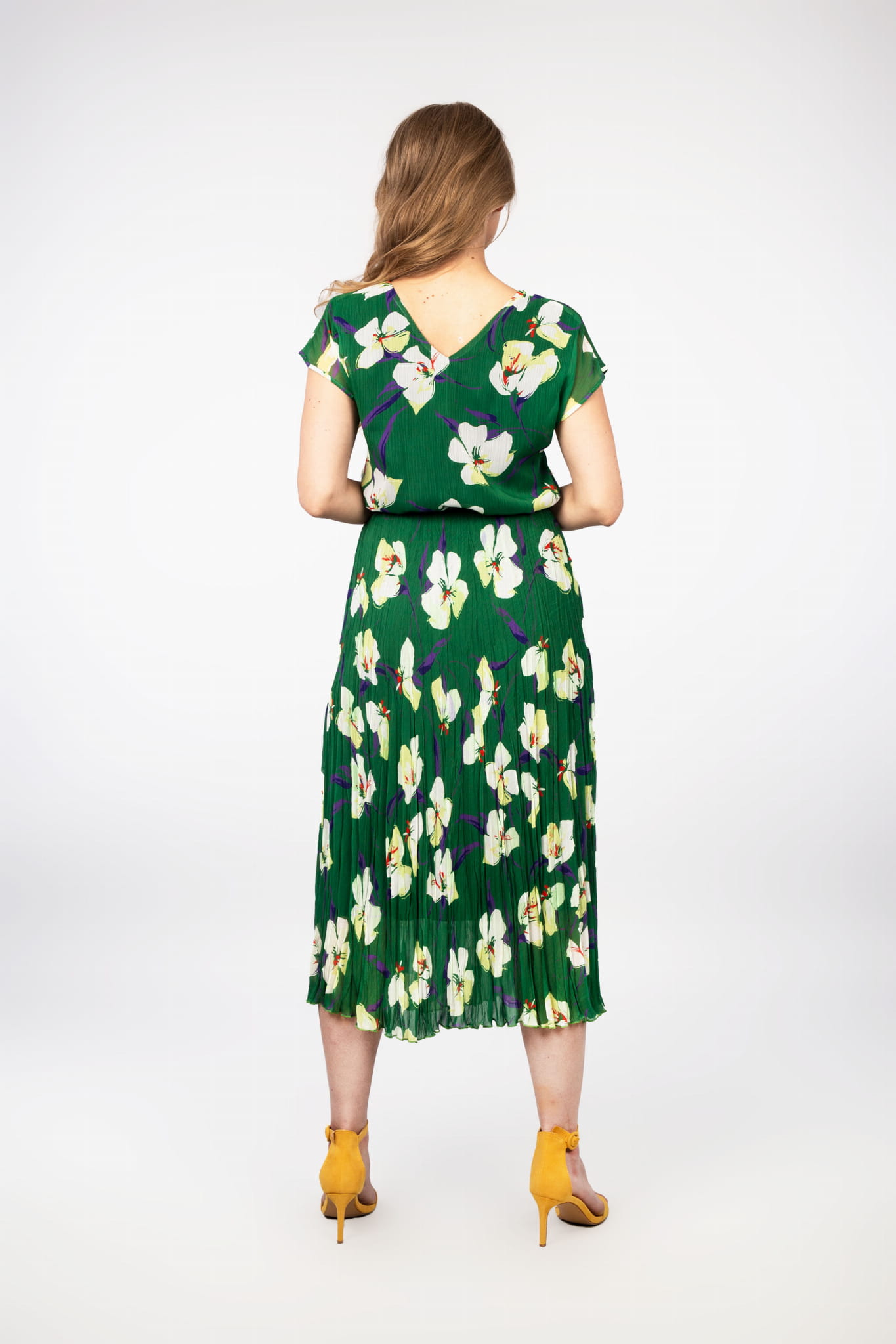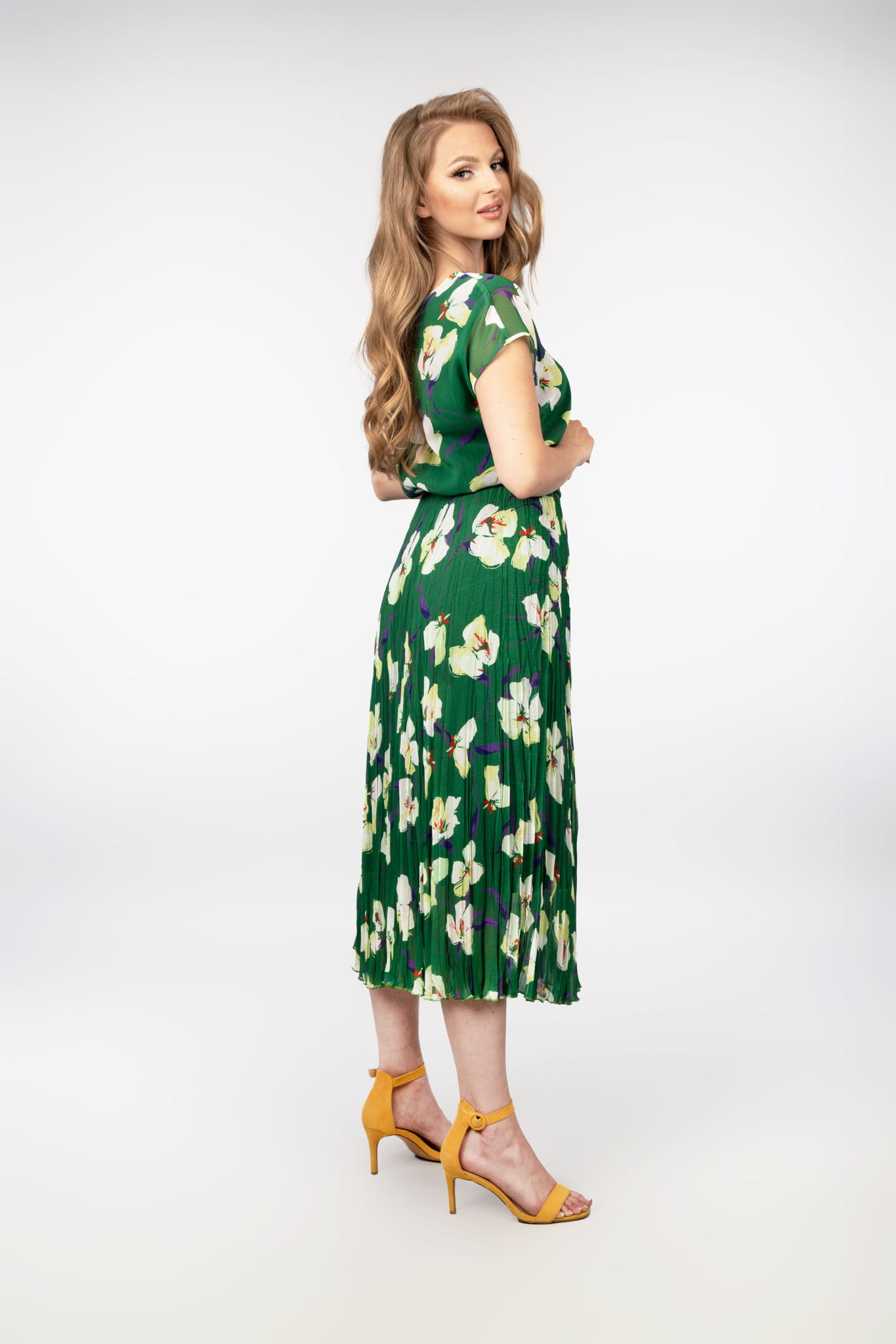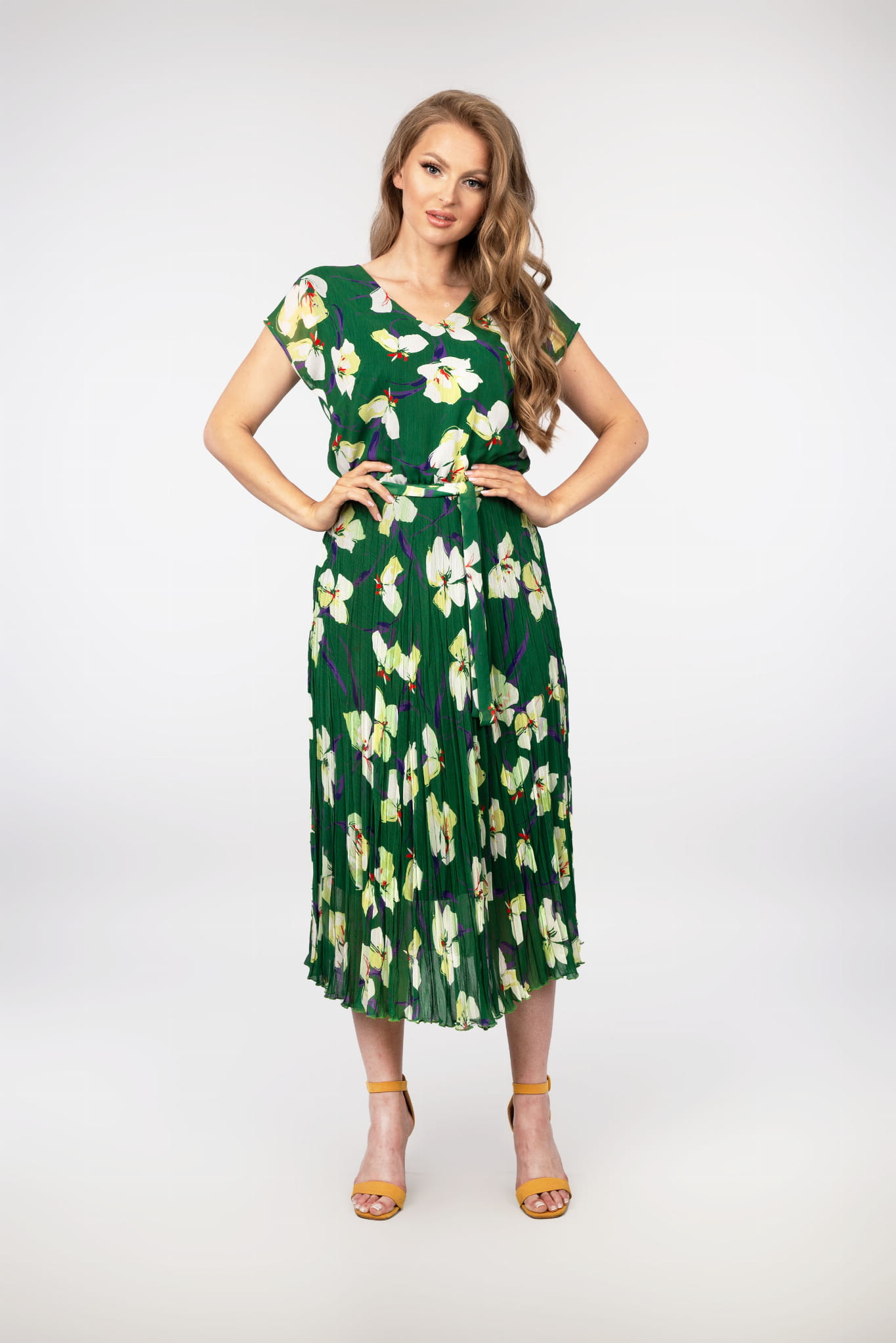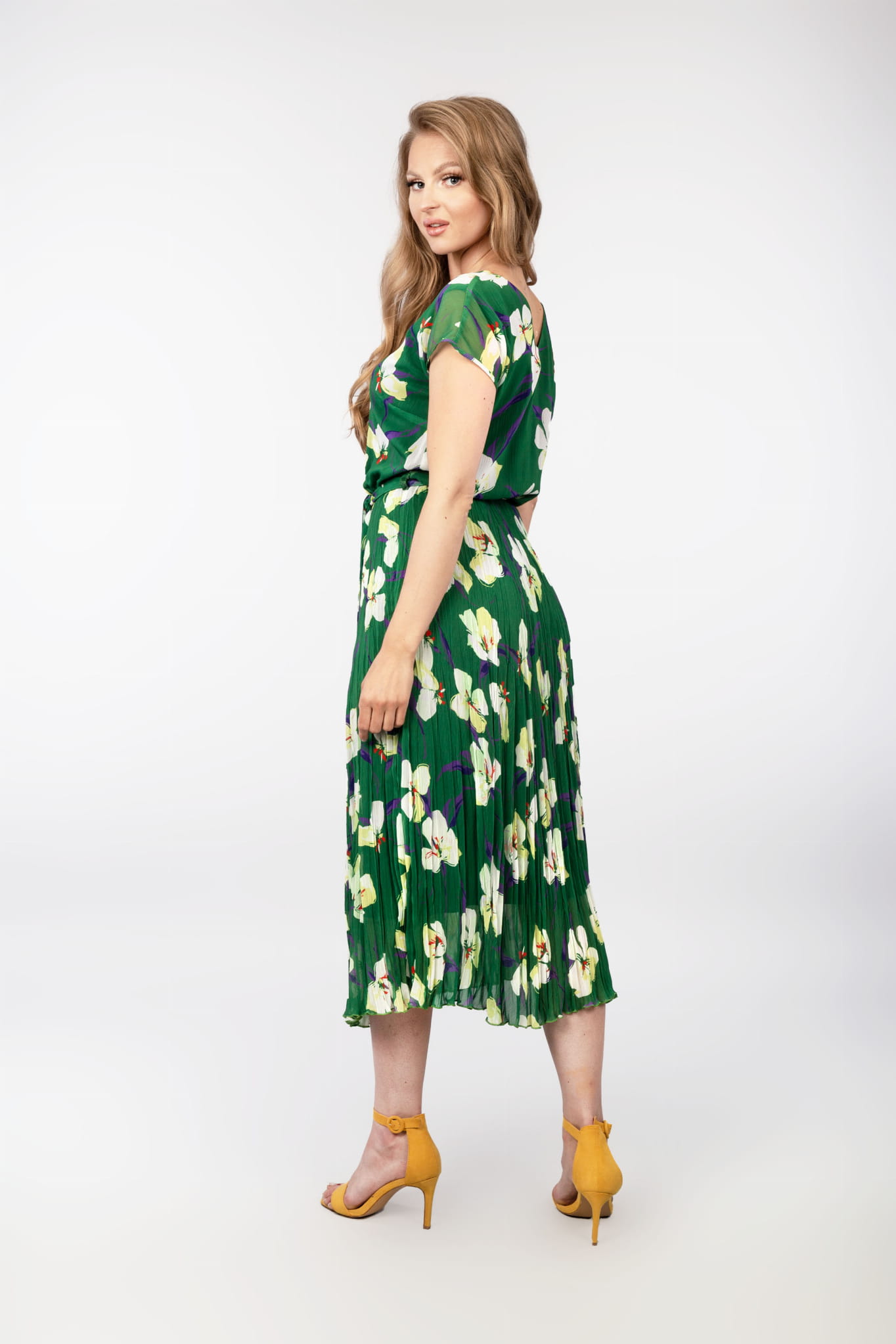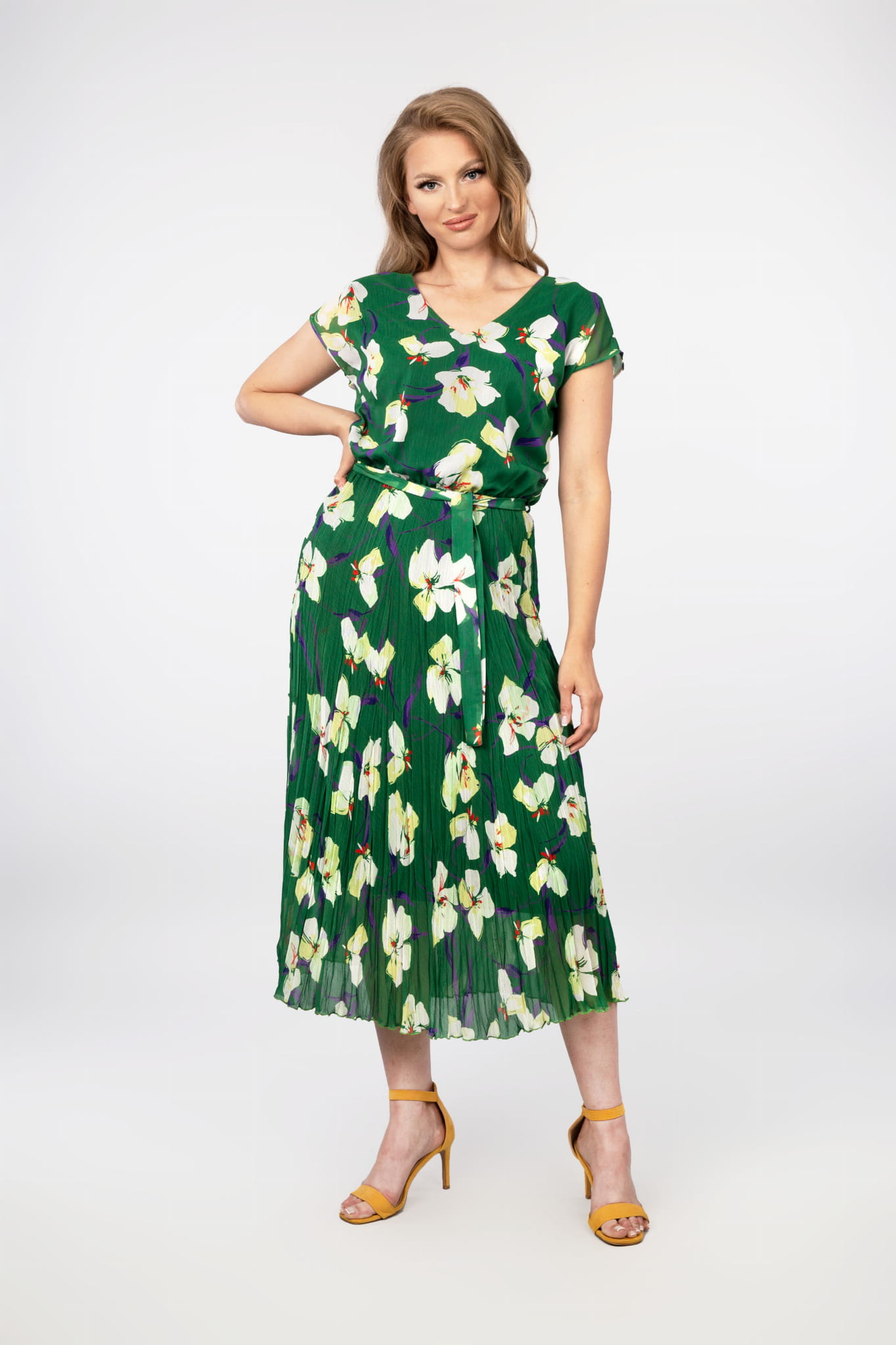 - długa sukienka z szyfonu, w kolorze zielonym z motywem kwiatowym