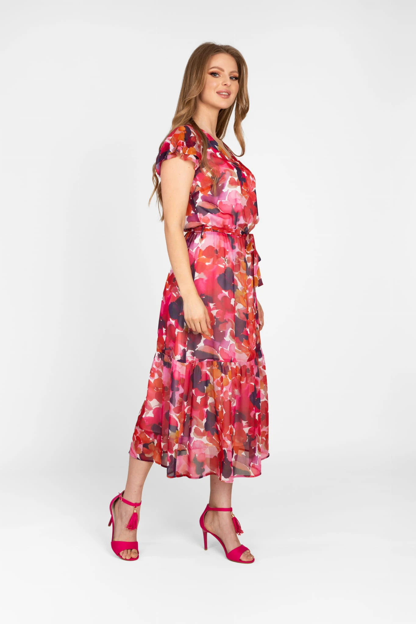 - sukienka szyfonowa, długa, w kolorze koralowym z motywem kwiatowym