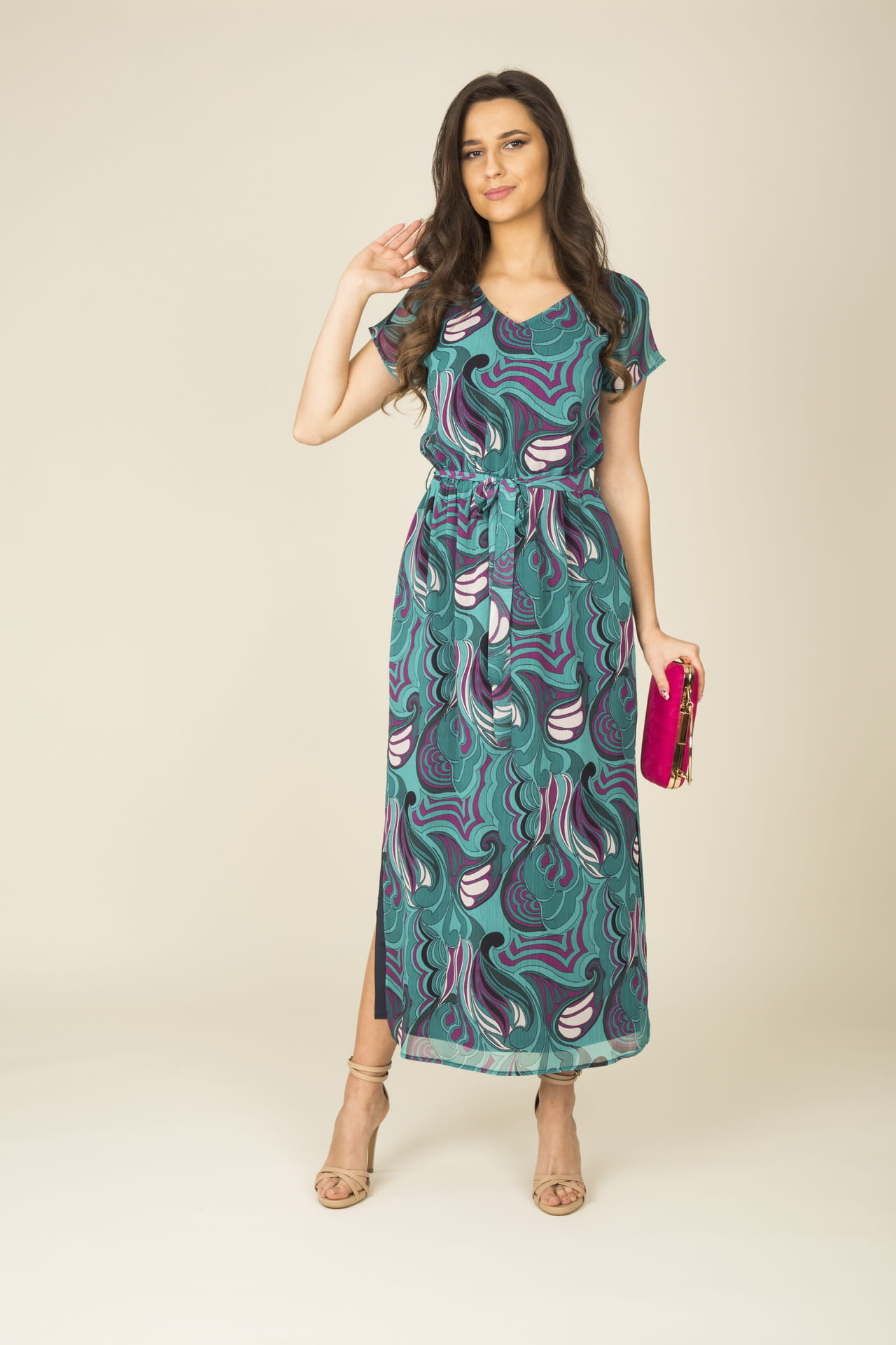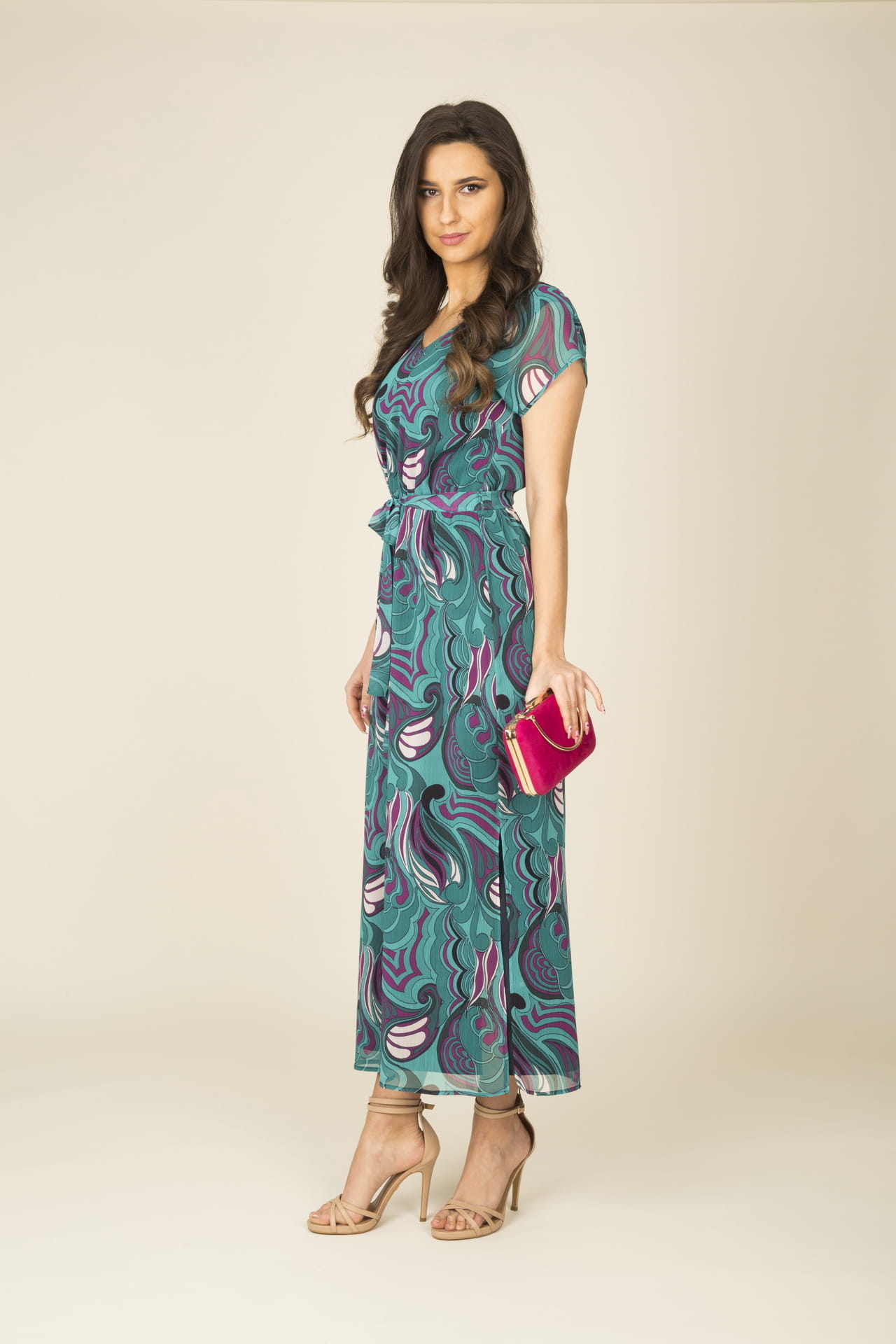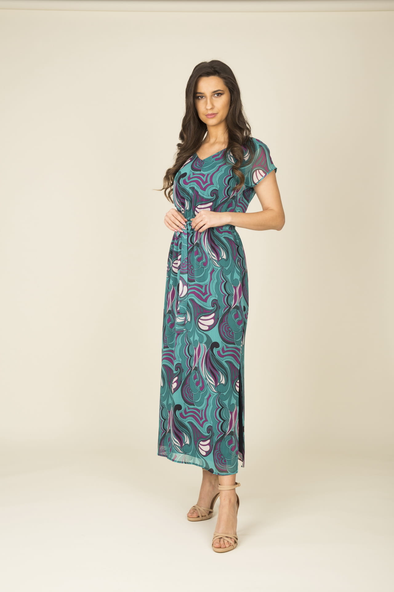 - długa, szyfonowa sukienka